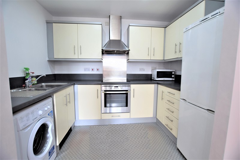 A range of modern wall and base units with work surfaces, sink with mixer taps, built oven and ceramic hob with extractor hood, microwave, washing machine and fridge freezer included